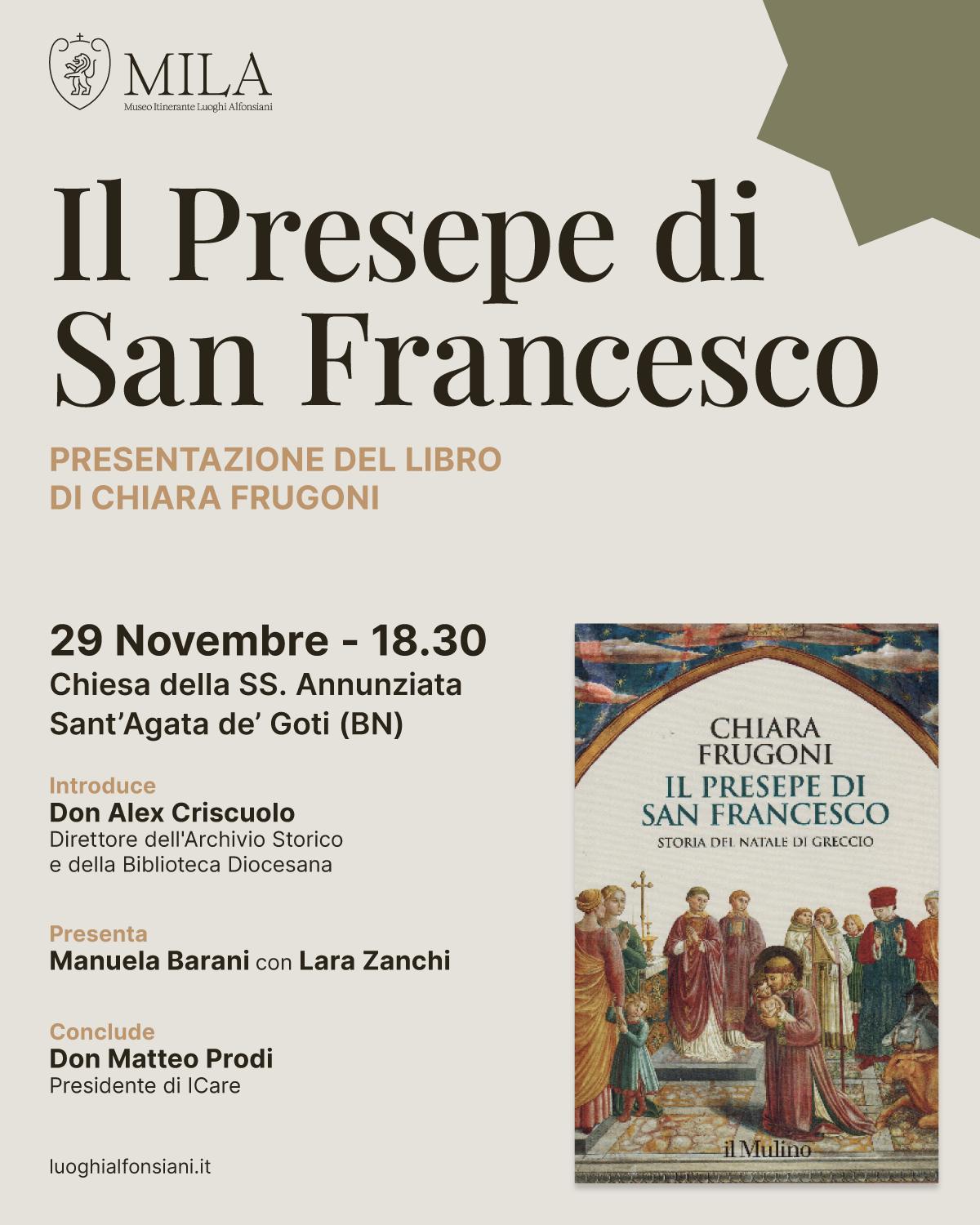 Nei prossimi giorni presenterà tre iniziative, il MILA – Museo Itinerante Luoghi Alfonsiani, che a Sant’Agata de’ Goti fonde cultura, bellezza e fede attraverso due percorsi turistici sui luoghi che testimoniano la presenza, la vita e la predicazione del vescovo napoletano Sant’Alfonso Maria de’ Liguori. Venerdì 29 novembre alle ore 18:30, infatti, presso la suggestiva Chiesa della SS. Annunziata, avrà luogo la presentazione del libro “Il Presepe di San Francesco” di Chiara Frugoni, la storica e scrittrice italiana, specialista del Medioevo e di storia della Chiesa, scomparsa nel 2022. Un viaggio nel cuore del Natale. Un’opera che ci guida alle origini di una delle tradizioni più amate, raccontando la storia del primo presepe di Greccio e il profondo significato spirituale che San Francesco gli ha donato. Introdurrà la serata il Direttore dell’Archivio Storico e della Biblioteca Diocesana don Alex Criscuolo, mentre presenteranno il libro Manuela Barani e Lara Zanchi. Le conclusioni saranno affidate al presidente della cooperativa sociale di comunità iCare don Matteo Prodi. Un’occasione senz’altro speciale per lasciarsi ispirare e per riscoprire le radici del Natale attraverso l’arte, la storia e la spiritualità. Il secondo appuntamento, ospitato dal MILA, è il secondo Open Day di presentazione e degustazione dei dolci della tradizione natalizia e dei panettoni artigianali preparati e prodotti dal Laboratorio di Pasticceria Sociale DolceMente. Aperto, con ingresso gratuito senza prenotazione, per aziende e privati il secondo Open Day si svolgerà domenica 1 dicembre, dalle ore 10 alle ore 14, presso l’affascinante Sala degli Stemmi del Palazzo Episcopale (piazza Umberto I). La terza iniziativa sarà un’esperienza culinaria, “Kairos”, che verrà vissuta venerdì 13 dicembre alle ore 20 nel cunicolo seicentesco del Palazzo Vescovile, uno dei luoghi del tour storico-culturale proposto dal MILA. Un viaggio gastronomico particolare e unico nel suo genere, che celebrerà l’arte della cucina e il senso del tempo, laddove ogni assaggio racconta una storia da custodire. Per info e prenotazioni: cell. 380 3447661.
